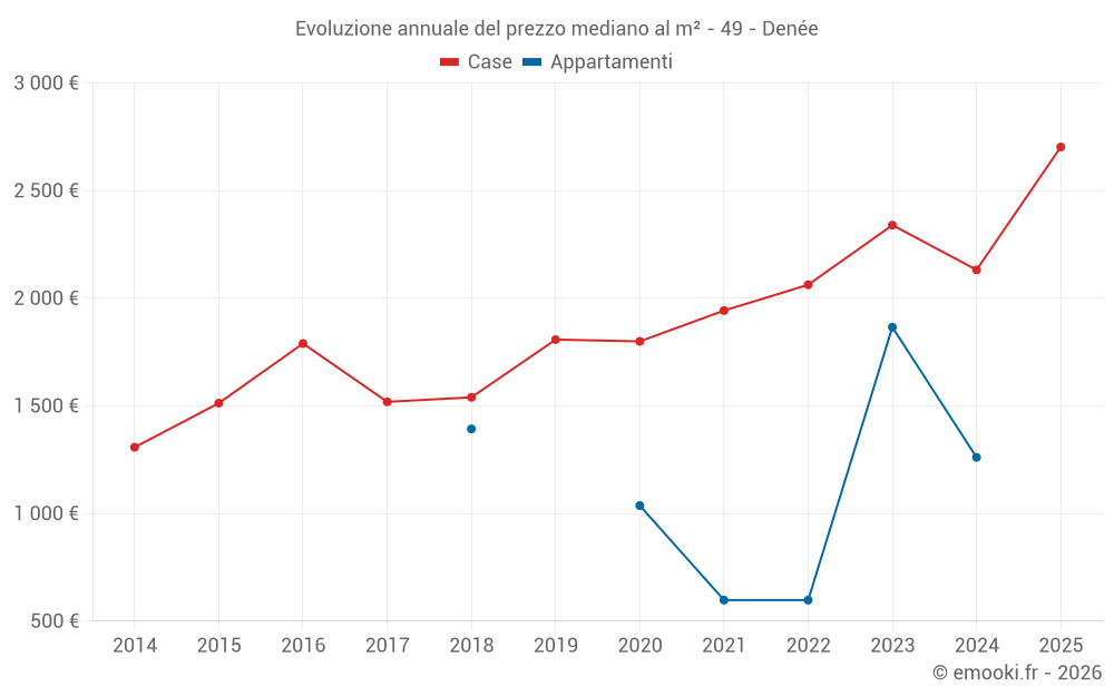 Il prezzo mediano sulle 31 transazioni di case degli ultimi 24 mesi nel comune di Denée era di 2 413 € al metro quadrato per un valore patrimoniale mediano di 255 000 €. In questo periodo il 60% delle transazioni era tra 1 793 e 2 790 € al metro quadrato (dal 2° all'8° decile).