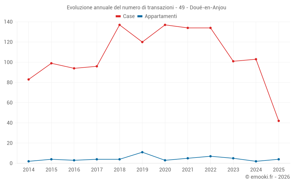 Il prezzo mediano sulle 42 transazioni di case degli ultimi 6 mesi nel comune di Doué-en-Anjou era di 1 624 € al metro quadrato per un valore patrimoniale mediano di 160 000 €. In questo periodo il 60% delle transazioni era tra 1 144 e 2 107 € al metro quadrato (dal 2° all'8° decile).