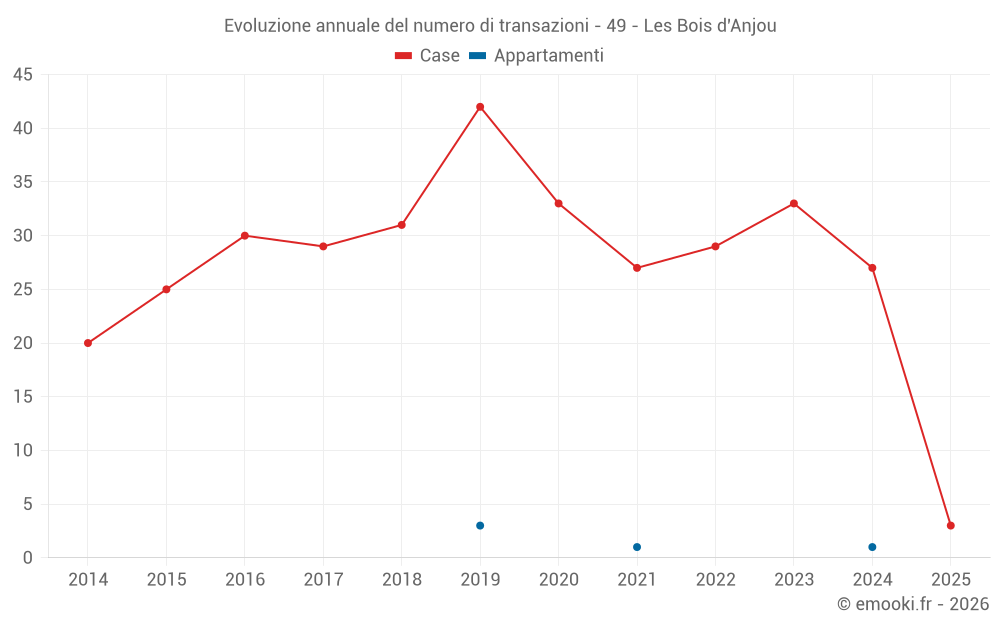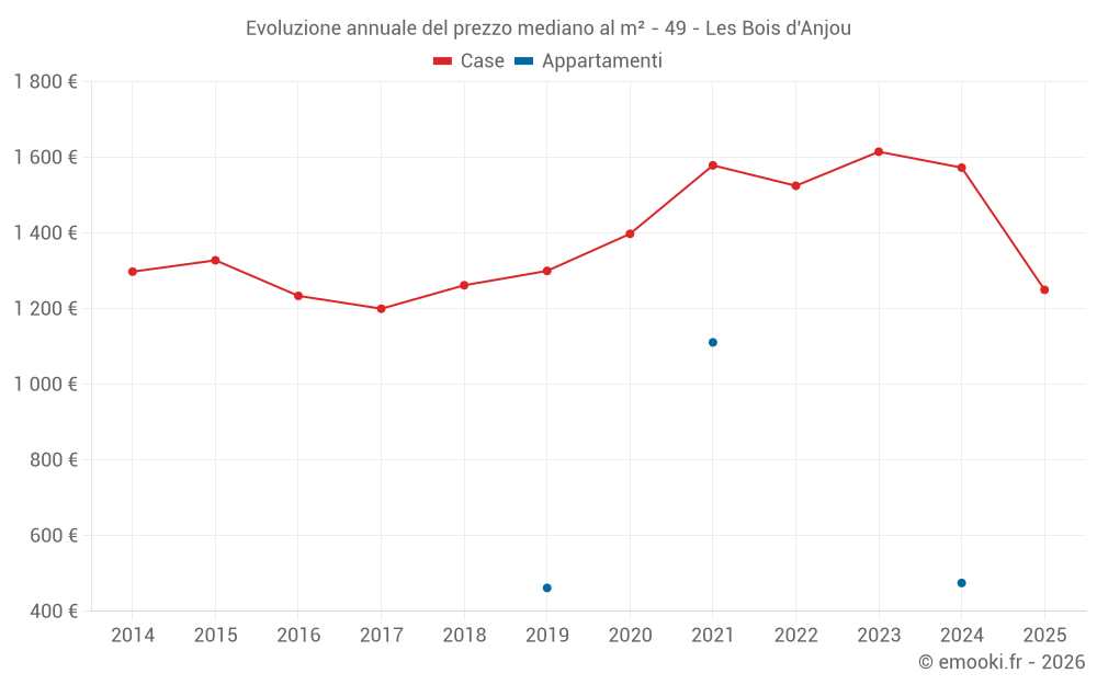 Il prezzo mediano sulle 45 transazioni di case degli ultimi 24 mesi nel comune di Les Bois d'Anjou era di 1 573 € al metro quadrato per un valore patrimoniale mediano di 147 000 €. In questo periodo il 60% delle transazioni era tra 1 116 e 1 913 € al metro quadrato (dal 2° all'8° decile).