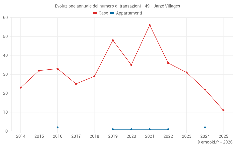 Il prezzo mediano sulle 26 transazioni di case degli ultimi 12 mesi nel comune di Jarzé Villages era di 1 978 € al metro quadrato per un valore patrimoniale mediano di 205 125 €. In questo periodo il 60% delle transazioni era tra 1 524 e 2 303 € al metro quadrato (dal 2° all'8° decile).