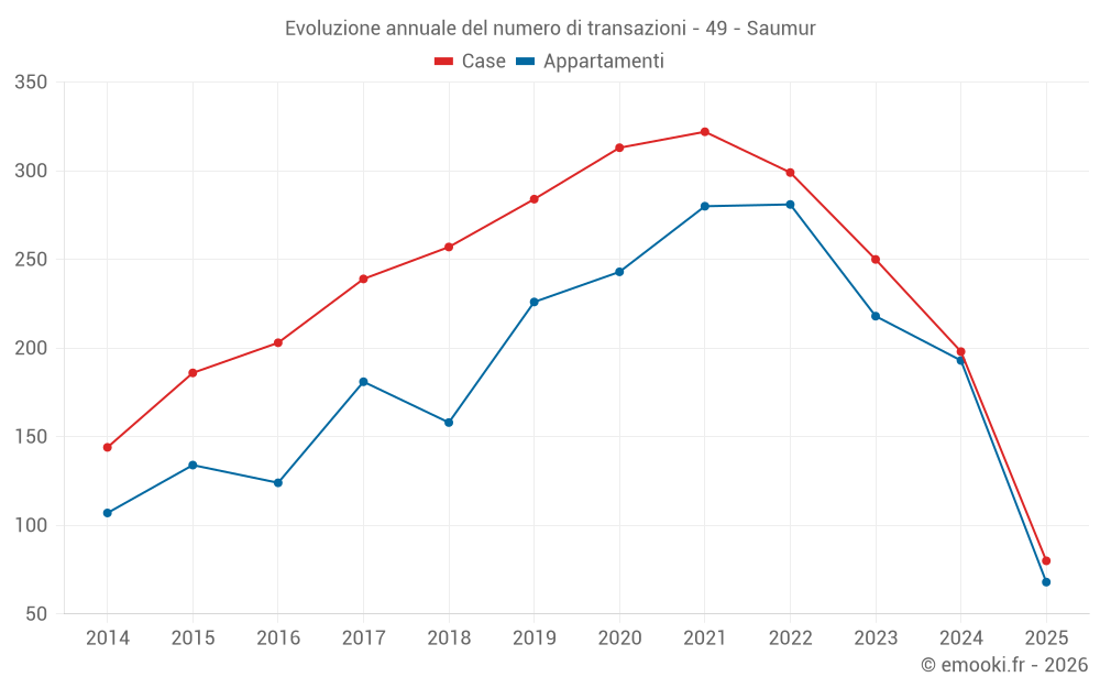 Il prezzo mediano sulle 80 transazioni di case degli ultimi 6 mesi nel comune di Saumur era di 1 874 € al metro quadrato per un valore patrimoniale mediano di 191 000 €. In questo periodo il 60% delle transazioni era tra 1 230 e 2 651 € al metro quadrato (dal 2° all'8° decile).