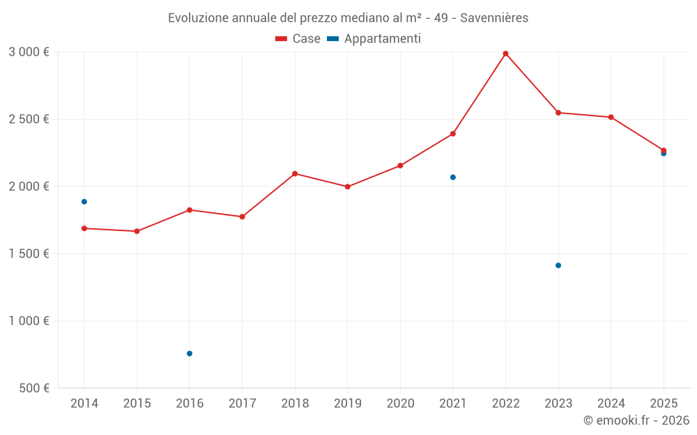 Il prezzo mediano sulle 26 transazioni di case degli ultimi 24 mesi nel comune di Savennières era di 2 491 € al metro quadrato per un valore patrimoniale mediano di 234 500 €. In questo periodo il 60% delle transazioni era tra 1 914 e 3 019 € al metro quadrato (dal 2° all'8° decile).