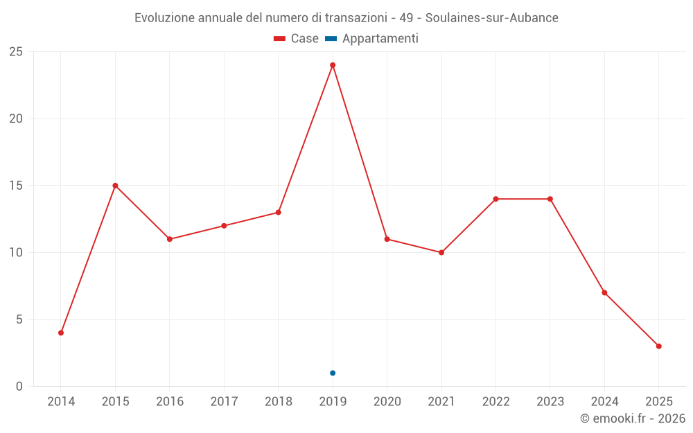 Il prezzo mediano sulle 17 transazioni di case degli ultimi 24 mesi nel comune di Soulaines-sur-Aubance era di 2 619 € al metro quadrato per un valore patrimoniale mediano di 287 000 €. In questo periodo il 60% delle transazioni era tra 1 652 e 2 902 € al metro quadrato (dal 2° all'8° decile).