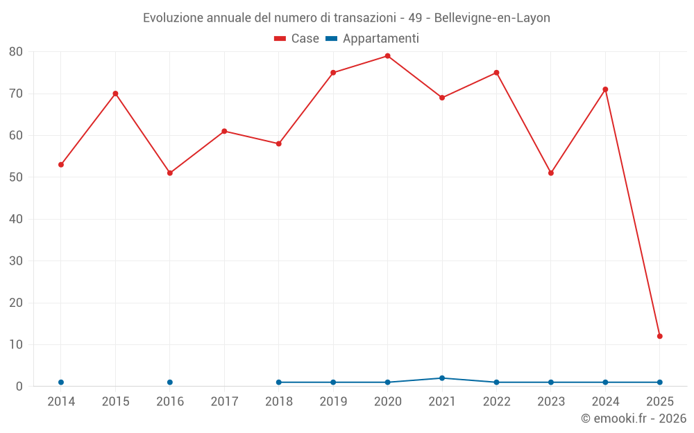 Il prezzo mediano sulle 54 transazioni di case degli ultimi 12 mesi nel comune di Bellevigne-en-Layon era di 1 786 € al metro quadrato per un valore patrimoniale mediano di 158 500 €. In questo periodo il 60% delle transazioni era tra 1 072 e 2 260 € al metro quadrato (dal 2° all'8° decile).