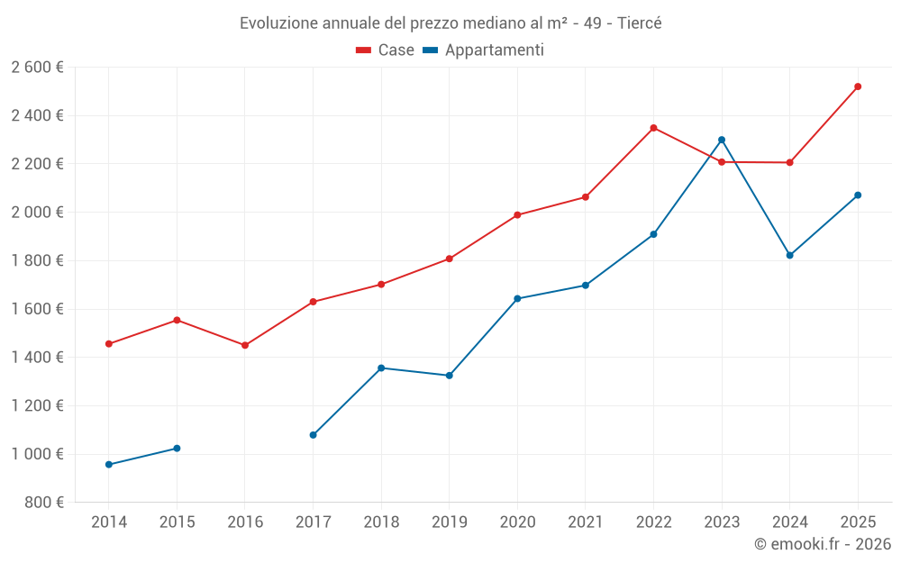 Il prezzo mediano sulle 51 transazioni di case degli ultimi 12 mesi nel comune di Tiercé era di 2 233 € al metro quadrato per un valore patrimoniale mediano di 252 500 €. In questo periodo il 60% delle transazioni era tra 1 899 e 2 895 € al metro quadrato (dal 2° all'8° decile).