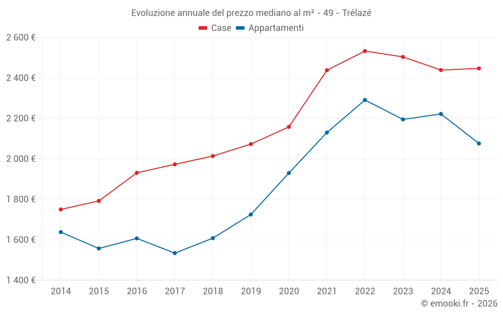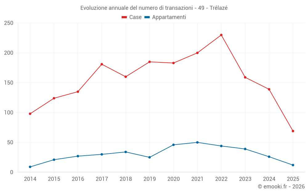 Il prezzo mediano sulle 21 transazioni di case degli ultimi 3 mesi nel comune di Trélazé era di 2 355 € al metro quadrato per un valore patrimoniale mediano di 218 000 €. In questo periodo il 60% delle transazioni era tra 2 218 e 2 784 € al metro quadrato (dal 2° all'8° decile).