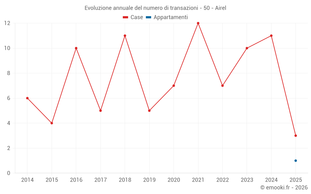 Il prezzo mediano sulle 20 transazioni di case degli ultimi 24 mesi nel comune di Airel era di 1 235 € al metro quadrato per un valore patrimoniale mediano di 111 438 €. In questo periodo il 60% delle transazioni era tra 613 e 1 691 € al metro quadrato (dal 2° all'8° decile).