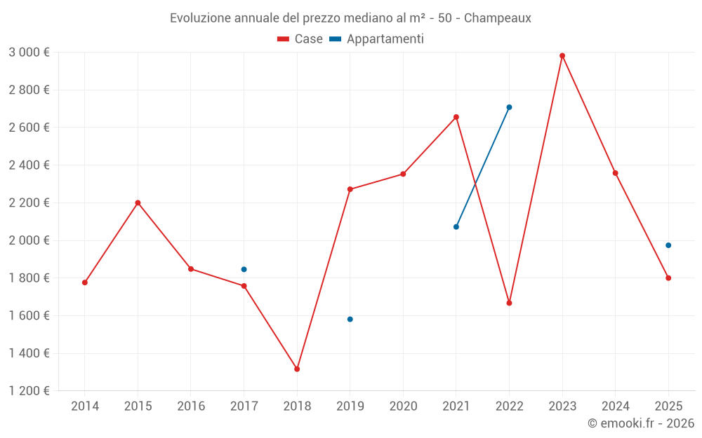 Il prezzo mediano sulle 19 transazioni di case degli ultimi 24 mesi nel comune di Champeaux era di 2 415 € al metro quadrato per un valore patrimoniale mediano di 240 000 €. In questo periodo il 60% delle transazioni era tra 2 006 e 3 528 € al metro quadrato (dal 2° all'8° decile).