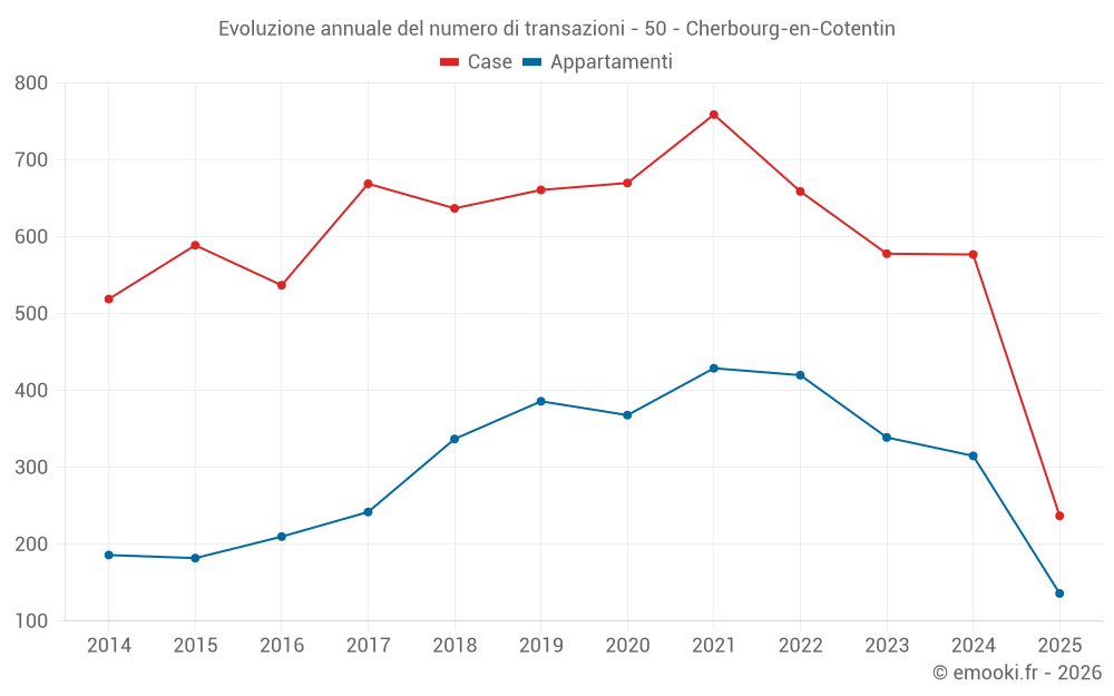 Il prezzo mediano sulle 68 transazioni di appartamenti degli ultimi 3 mesi nel comune di Cherbourg-en-Cotentin era di 2 398 € al metro quadrato per un valore patrimoniale mediano di 128 123 €. In questo periodo il 60% delle transazioni era tra 1 716 e 2 776 € al metro quadrato (dal 2° all'8° decile).