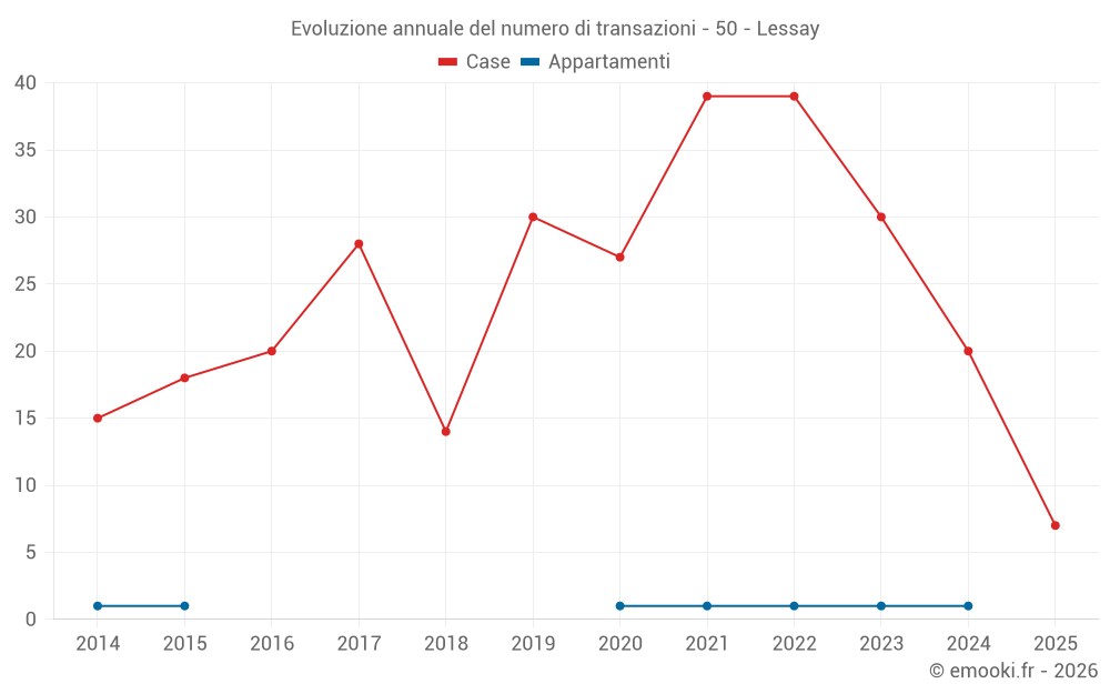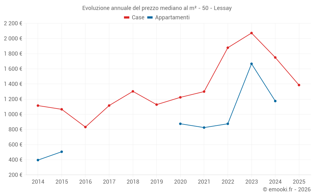Il prezzo mediano sulle 18 transazioni di case degli ultimi 12 mesi nel comune di Lessay era di 1 516 € al metro quadrato per un valore patrimoniale mediano di 140 000 €. In questo periodo il 60% delle transazioni era tra 1 050 e 2 126 € al metro quadrato (dal 2° all'8° decile).