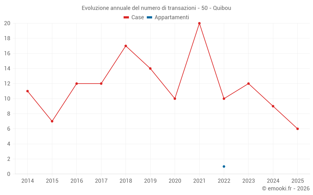 Il prezzo mediano sulle 23 transazioni di case degli ultimi 24 mesi nel comune di Quibou era di 1 222 € al metro quadrato per un valore patrimoniale mediano di 127 000 €. In questo periodo il 60% delle transazioni era tra 921 e 1 916 € al metro quadrato (dal 2° all'8° decile).