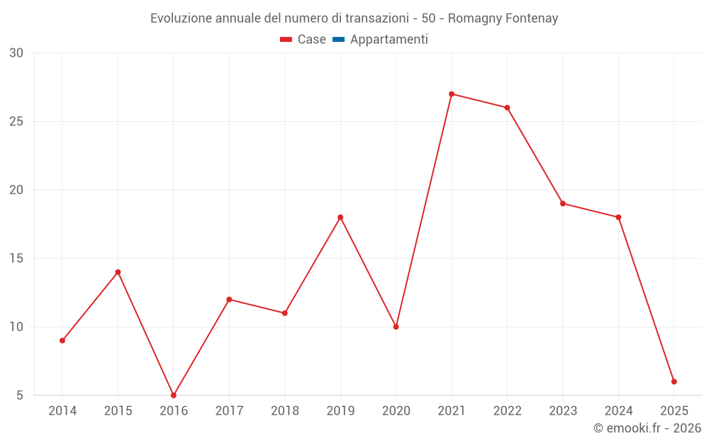 Il prezzo mediano sulle 16 transazioni di case degli ultimi 12 mesi nel comune di Romagny Fontenay era di 696 € al metro quadrato per un valore patrimoniale mediano di 67 500 €. In questo periodo il 60% delle transazioni era tra 559 e 1 169 € al metro quadrato (dal 2° all'8° decile).