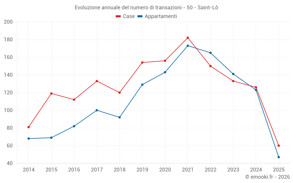 Il prezzo mediano sulle 47 transazioni di appartamenti degli ultimi 6 mesi nel comune di Saint-Lô era di 1 498 € al metro quadrato per un valore patrimoniale mediano di 82 000 €. In questo periodo il 60% delle transazioni era tra 1 089 e 1 745 € al metro quadrato (dal 2° all'8° decile).