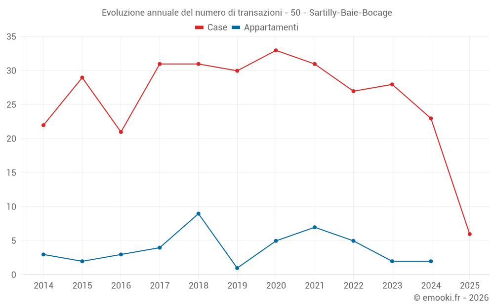 Il prezzo mediano sulle 18 transazioni di case degli ultimi 12 mesi nel comune di Sartilly-Baie-Bocage era di 2 022 € al metro quadrato per un valore patrimoniale mediano di 192 250 €. In questo periodo il 60% delle transazioni era tra 1 545 e 2 896 € al metro quadrato (dal 2° all'8° decile).