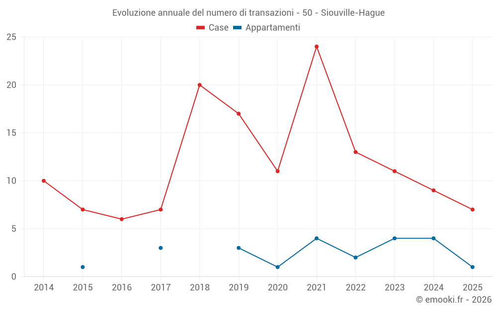 Il prezzo mediano sulle 20 transazioni di case degli ultimi 24 mesi nel comune di Siouville-Hague era di 3 050 € al metro quadrato per un valore patrimoniale mediano di 255 490 €. In questo periodo il 60% delle transazioni era tra 2 234 e 3 695 € al metro quadrato (dal 2° all'8° decile).