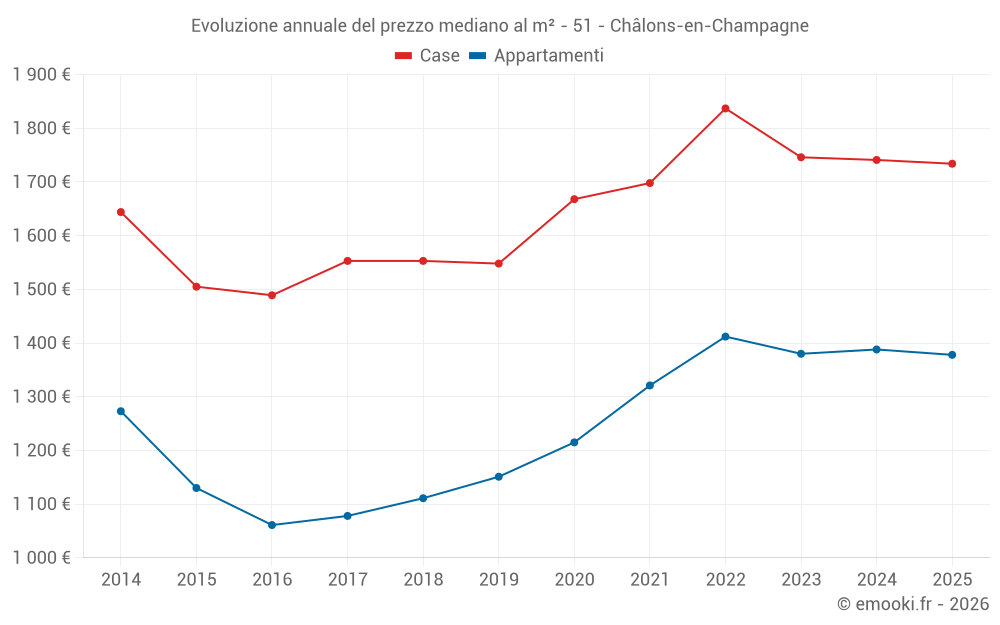 Il prezzo mediano sulle 46 transazioni di appartamenti degli ultimi 3 mesi nel comune di Châlons-en-Champagne era di 1 296 € al metro quadrato per un valore patrimoniale mediano di 82 510 €. In questo periodo il 60% delle transazioni era tra 1 014 e 1 676 € al metro quadrato (dal 2° all'8° decile).