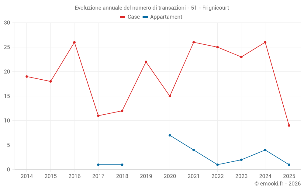Il prezzo mediano sulle 23 transazioni di case degli ultimi 12 mesi nel comune di Frignicourt era di 1 198 € al metro quadrato per un valore patrimoniale mediano di 86 010 €. In questo periodo il 60% delle transazioni era tra 1 001 e 1 444 € al metro quadrato (dal 2° all'8° decile).