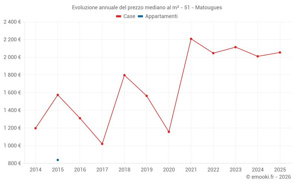 Il prezzo mediano sulle 18 transazioni di case degli ultimi 24 mesi nel comune di Matougues era di 1 980 € al metro quadrato per un valore patrimoniale mediano di 174 500 €. In questo periodo il 60% delle transazioni era tra 1 767 e 2 285 € al metro quadrato (dal 2° all'8° decile).