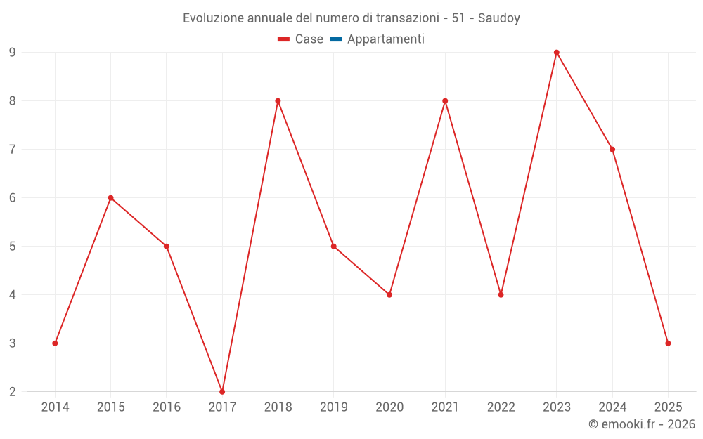 Il prezzo mediano sulle 16 transazioni di case degli ultimi 24 mesi nel comune di Saudoy era di 1 296 € al metro quadrato per un valore patrimoniale mediano di 108 495 €. In questo periodo il 60% delle transazioni era tra 818 e 1 722 € al metro quadrato (dal 2° all'8° decile).