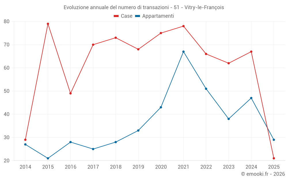 Il prezzo mediano sulle 29 transazioni di appartamenti degli ultimi 6 mesi nel comune di Vitry-le-François era di 1 042 € al metro quadrato per un valore patrimoniale mediano di 73 000 €. In questo periodo il 60% delle transazioni era tra 857 e 1 186 € al metro quadrato (dal 2° all'8° decile).