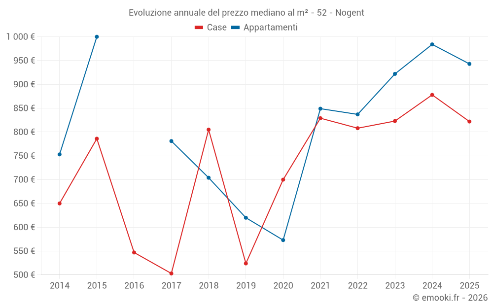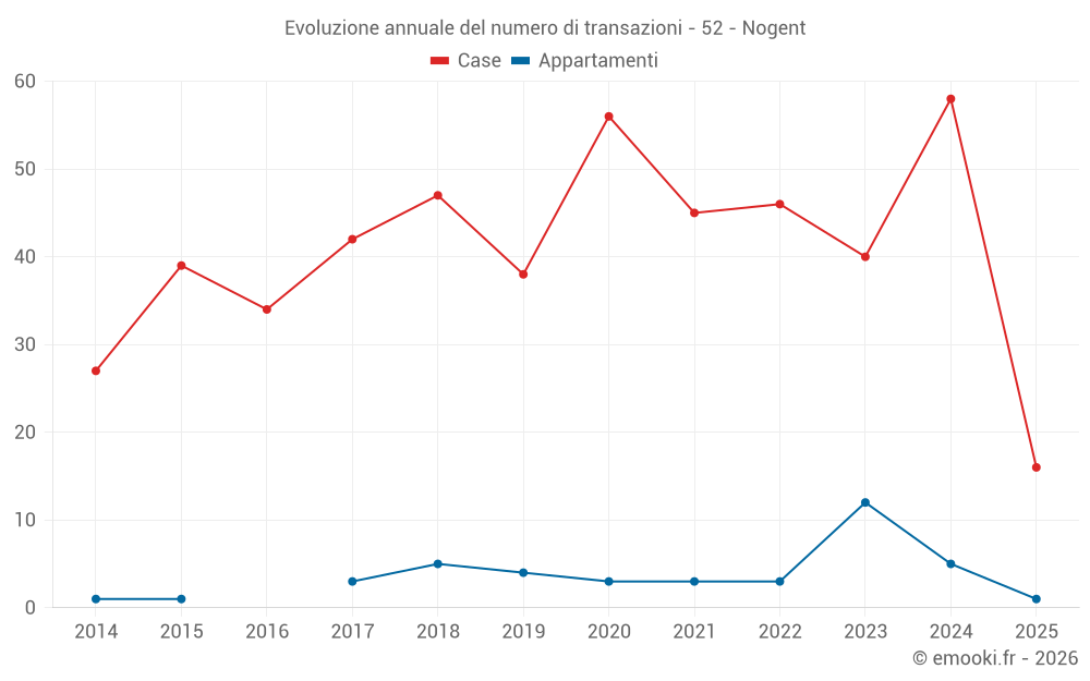 Il prezzo mediano sulle 14 transazioni di appartamenti degli ultimi 24 mesi nel comune di Nogent era di 982 € al metro quadrato per un valore patrimoniale mediano di 49 500 €. In questo periodo il 60% delle transazioni era tra 856 e 1 062 € al metro quadrato (dal 2° all'8° decile).