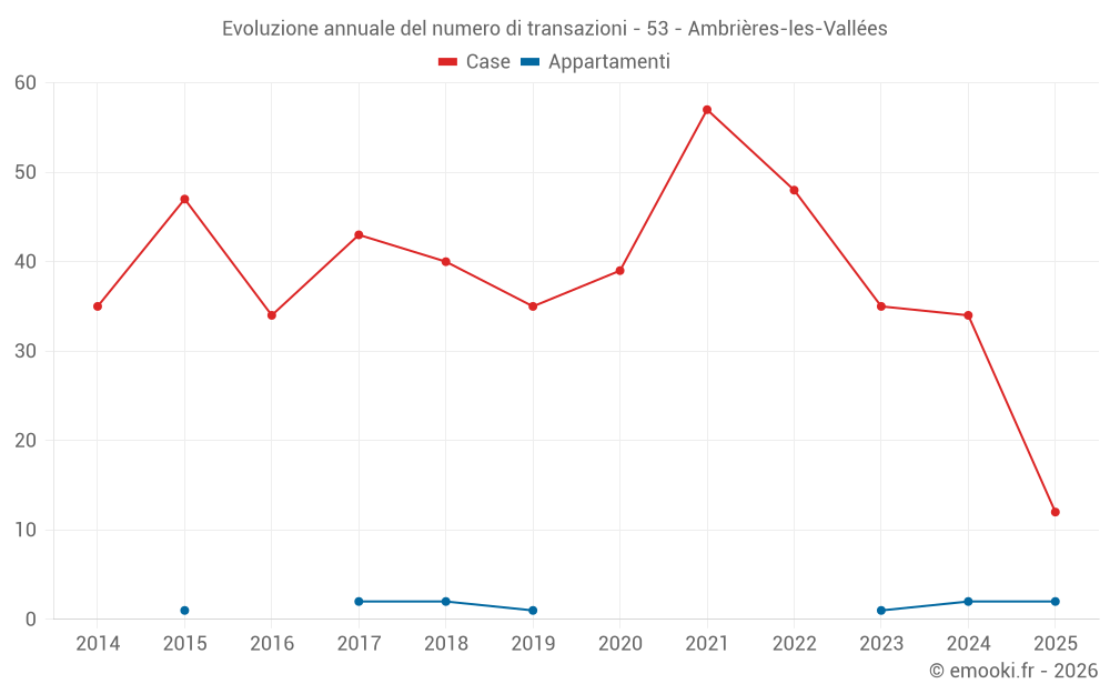 Il prezzo mediano sulle 28 transazioni di case degli ultimi 12 mesi nel comune di Ambrières-les-Vallées era di 1 191 € al metro quadrato per un valore patrimoniale mediano di 108 938 €. In questo periodo il 60% delle transazioni era tra 807 e 1 536 € al metro quadrato (dal 2° all'8° decile).