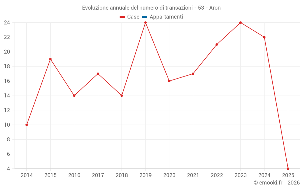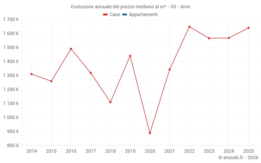 Il prezzo mediano sulle 18 transazioni di case degli ultimi 12 mesi nel comune di Aron era di 1 673 € al metro quadrato per un valore patrimoniale mediano di 144 402 €. In questo periodo il 60% delle transazioni era tra 970 e 2 030 € al metro quadrato (dal 2° all'8° decile).