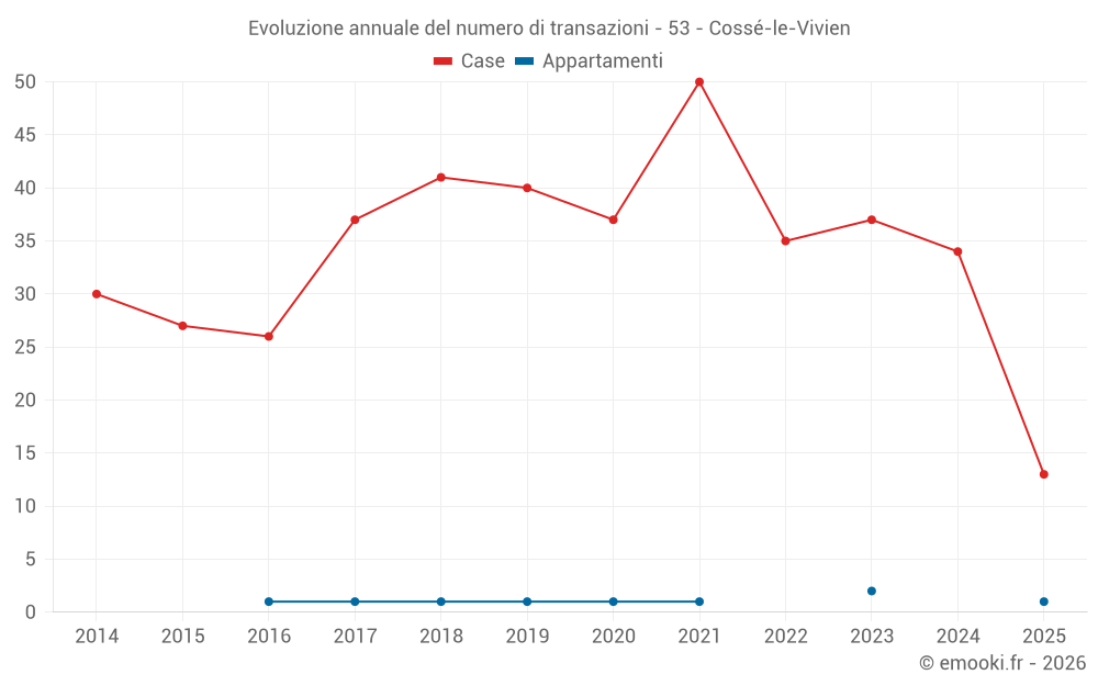 Il prezzo mediano sulle 33 transazioni di case degli ultimi 12 mesi nel comune di Cossé-le-Vivien era di 1 496 € al metro quadrato per un valore patrimoniale mediano di 146 000 €. In questo periodo il 60% delle transazioni era tra 1 019 e 1 914 € al metro quadrato (dal 2° all'8° decile).