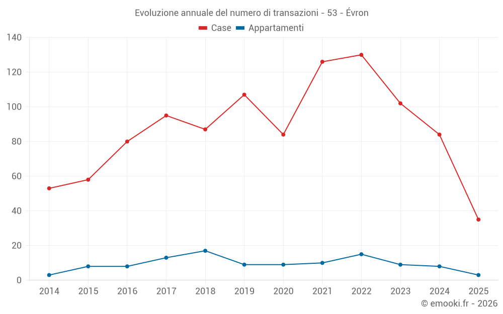 Il prezzo mediano sulle 35 transazioni di case degli ultimi 6 mesi nel comune di Évron era di 1 291 € al metro quadrato per un valore patrimoniale mediano di 110 000 €. In questo periodo il 60% delle transazioni era tra 989 e 1 713 € al metro quadrato (dal 2° all'8° decile).
