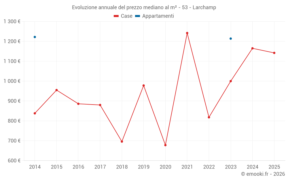 Il prezzo mediano sulle 40 transazioni di case degli ultimi 24 mesi nel comune di Larchamp era di 1 132 € al metro quadrato per un valore patrimoniale mediano di 100 000 €. In questo periodo il 60% delle transazioni era tra 735 e 1 534 € al metro quadrato (dal 2° all'8° decile).