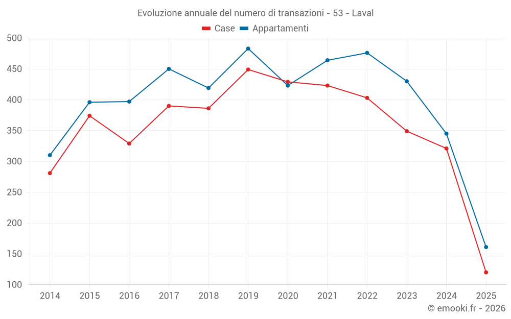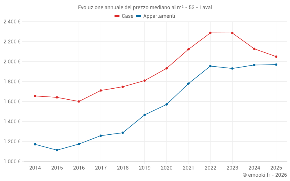 Il prezzo mediano sulle 62 transazioni di appartamenti degli ultimi 3 mesi nel comune di Laval era di 1 951 € al metro quadrato per un valore patrimoniale mediano di 108 550 €. In questo periodo il 60% delle transazioni era tra 1 547 e 2 465 € al metro quadrato (dal 2° all'8° decile).