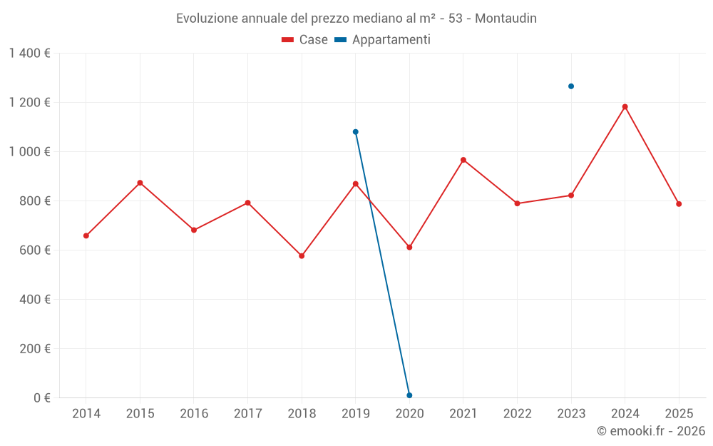 Il prezzo mediano sulle 26 transazioni di case degli ultimi 24 mesi nel comune di Montaudin era di 1 026 € al metro quadrato per un valore patrimoniale mediano di 95 000 €. In questo periodo il 60% delle transazioni era tra 681 e 1 322 € al metro quadrato (dal 2° all'8° decile).