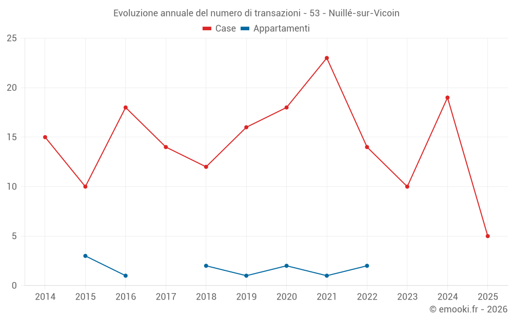 Il prezzo mediano sulle 17 transazioni di case degli ultimi 12 mesi nel comune di Nuillé-sur-Vicoin era di 1 673 € al metro quadrato per un valore patrimoniale mediano di 135 600 €. In questo periodo il 60% delle transazioni era tra 898 e 1 773 € al metro quadrato (dal 2° all'8° decile).
