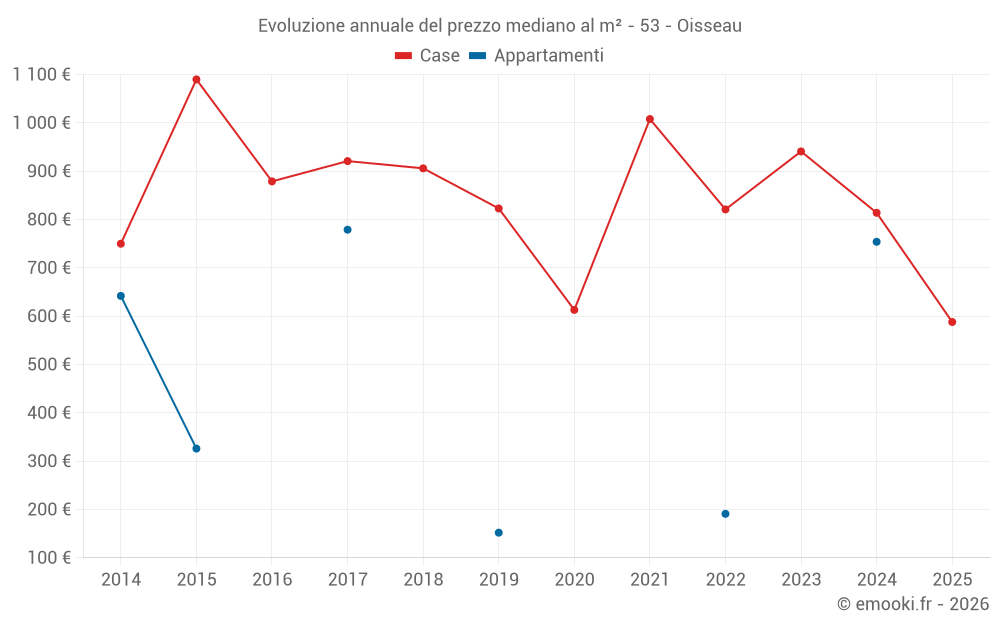 Il prezzo mediano sulle 26 transazioni di case degli ultimi 24 mesi nel comune di Oisseau era di 860 € al metro quadrato per un valore patrimoniale mediano di 81 106 €. In questo periodo il 60% delle transazioni era tra 588 e 1 368 € al metro quadrato (dal 2° all'8° decile).