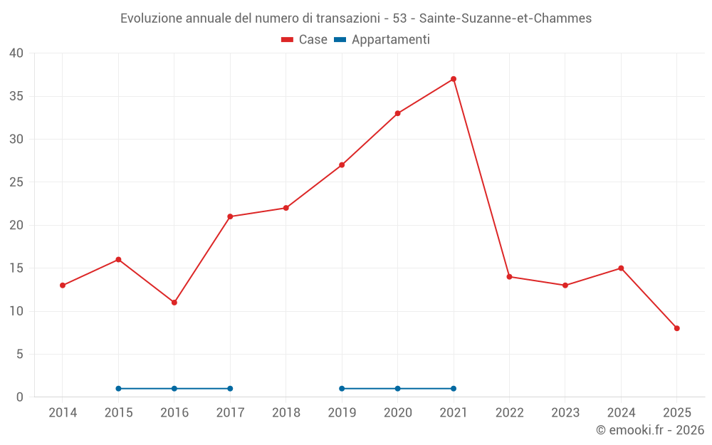 Il prezzo mediano sulle 20 transazioni di case degli ultimi 12 mesi nel comune di Sainte-Suzanne-et-Chammes era di 1 138 € al metro quadrato per un valore patrimoniale mediano di 120 000 €. In questo periodo il 60% delle transazioni era tra 800 e 1 539 € al metro quadrato (dal 2° all'8° decile).