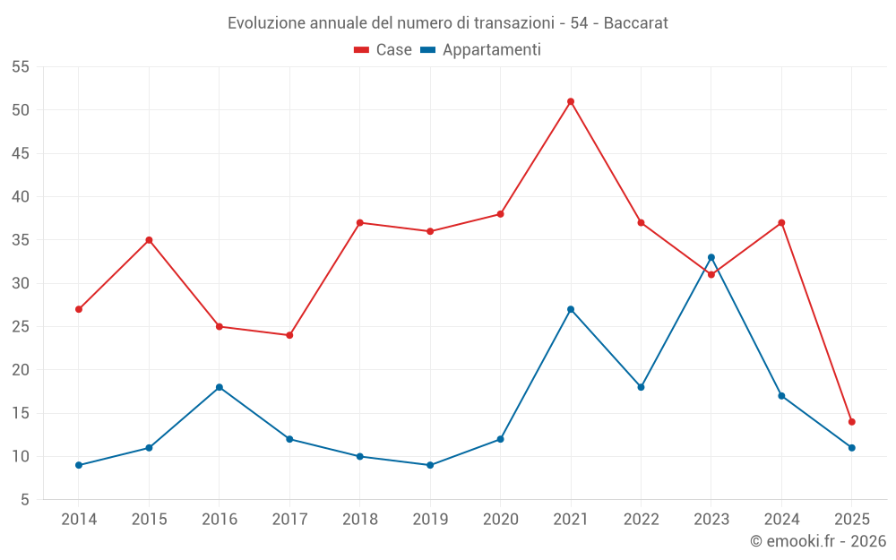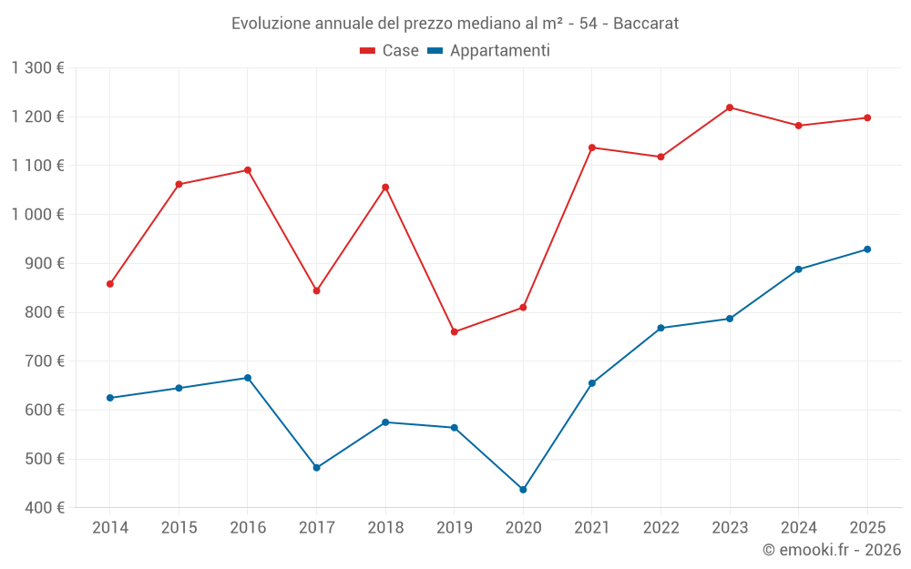 Il prezzo mediano sulle 32 transazioni di case degli ultimi 12 mesi nel comune di Baccarat era di 1 198 € al metro quadrato per un valore patrimoniale mediano di 96 000 €. In questo periodo il 60% delle transazioni era tra 688 e 1 705 € al metro quadrato (dal 2° all'8° decile).