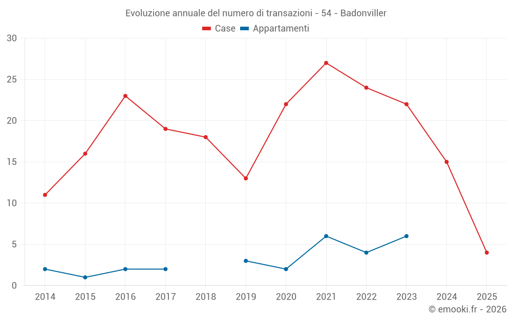 Il prezzo mediano sulle 27 transazioni di case degli ultimi 24 mesi nel comune di Badonviller era di 701 € al metro quadrato per un valore patrimoniale mediano di 64 000 €. In questo periodo il 60% delle transazioni era tra 501 e 1 235 € al metro quadrato (dal 2° all'8° decile).