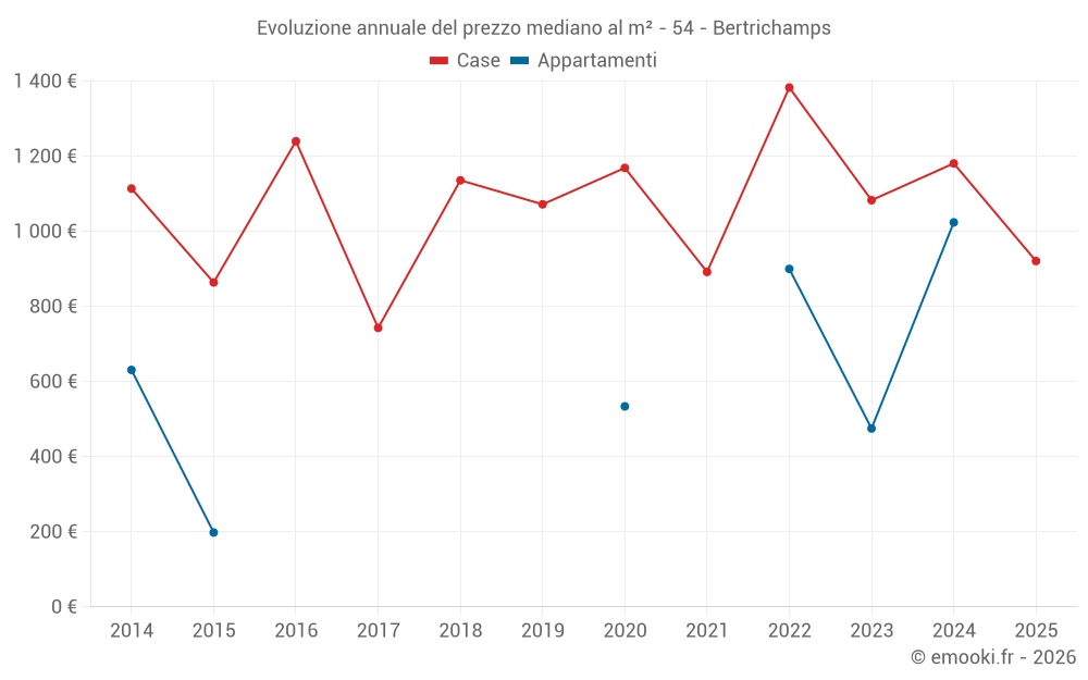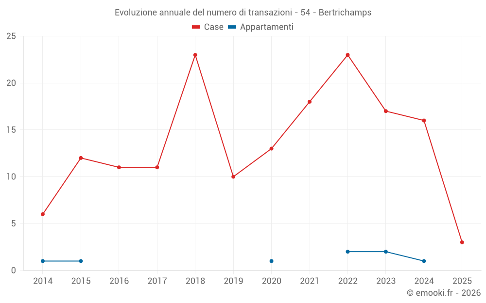 Il prezzo mediano sulle 29 transazioni di case degli ultimi 24 mesi nel comune di Bertrichamps era di 1 052 € al metro quadrato per un valore patrimoniale mediano di 131 200 €. In questo periodo il 60% delle transazioni era tra 738 e 1 822 € al metro quadrato (dal 2° all'8° decile).