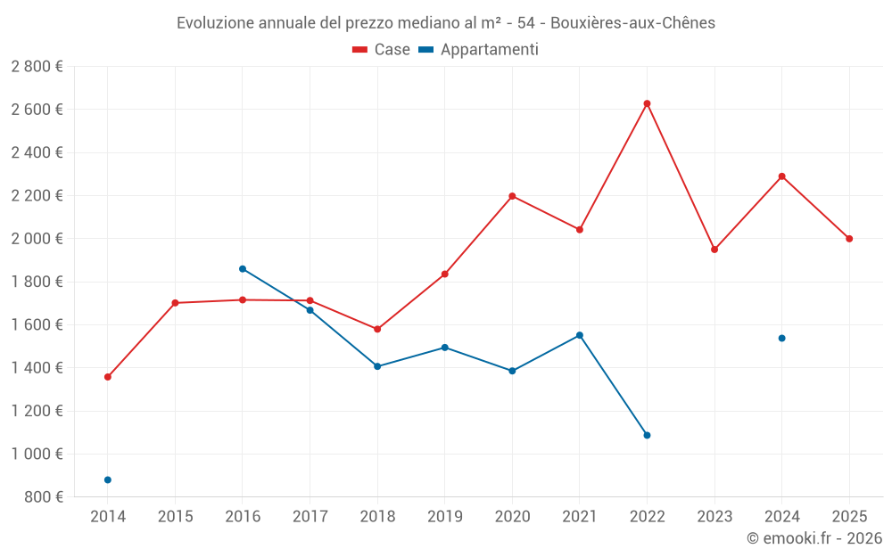 Il prezzo mediano sulle 16 transazioni di case degli ultimi 12 mesi nel comune di Bouxières-aux-Chênes era di 2 014 € al metro quadrato per un valore patrimoniale mediano di 251 875 €. In questo periodo il 60% delle transazioni era tra 1 394 e 2 659 € al metro quadrato (dal 2° all'8° decile).