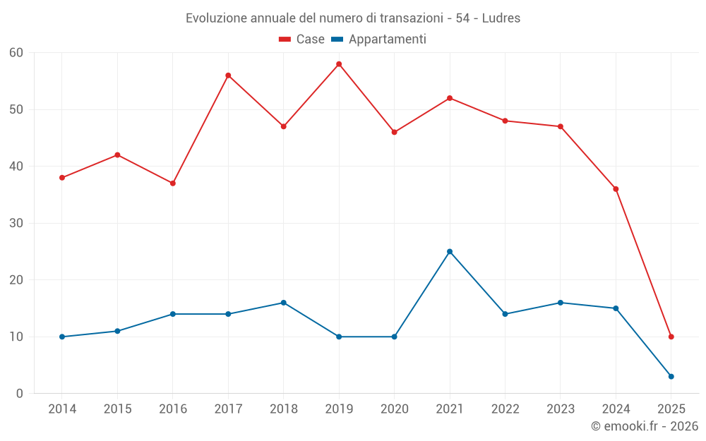 Il prezzo mediano sulle 27 transazioni di appartamenti degli ultimi 24 mesi nel comune di Ludres era di 1 801 € al metro quadrato per un valore patrimoniale mediano di 136 971 €. In questo periodo il 60% delle transazioni era tra 1 551 e 2 182 € al metro quadrato (dal 2° all'8° decile).