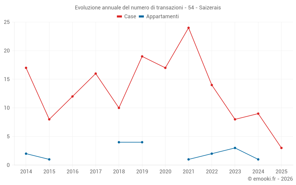 Il prezzo mediano sulle 16 transazioni di case degli ultimi 24 mesi nel comune di Saizerais era di 1 852 € al metro quadrato per un valore patrimoniale mediano di 197 500 €. In questo periodo il 60% delle transazioni era tra 857 e 2 191 € al metro quadrato (dal 2° all'8° decile).