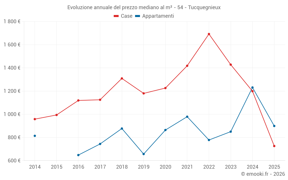 Il prezzo mediano sulle 18 transazioni di appartamenti degli ultimi 24 mesi nel comune di Tucquegnieux era di 1 160 € al metro quadrato per un valore patrimoniale mediano di 71 400 €. In questo periodo il 60% delle transazioni era tra 613 e 1 408 € al metro quadrato (dal 2° all'8° decile).