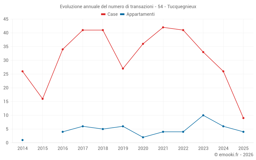 Il prezzo mediano sulle 24 transazioni di case degli ultimi 12 mesi nel comune di Tucquegnieux era di 1 028 € al metro quadrato per un valore patrimoniale mediano di 98 750 €. In questo periodo il 60% delle transazioni era tra 490 e 2 290 € al metro quadrato (dal 2° all'8° decile).
