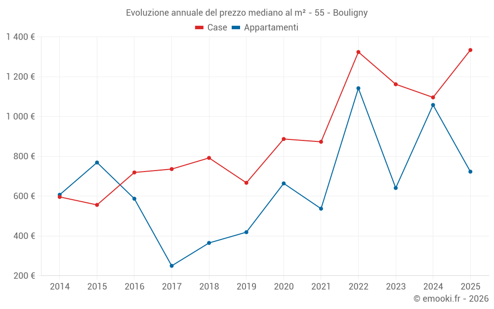 Il prezzo mediano sulle 36 transazioni di case degli ultimi 12 mesi nel comune di Bouligny era di 1 232 € al metro quadrato per un valore patrimoniale mediano di 109 850 €. In questo periodo il 60% delle transazioni era tra 867 e 1 543 € al metro quadrato (dal 2° all'8° decile).