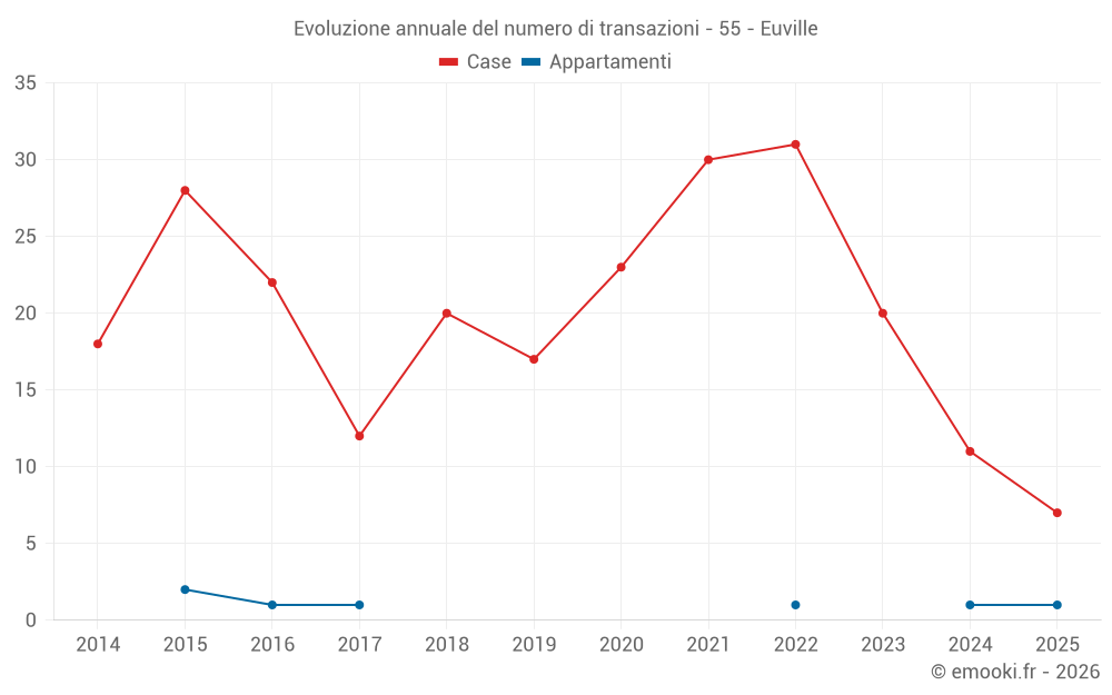 Il prezzo mediano sulle 27 transazioni di case degli ultimi 24 mesi nel comune di Euville era di 895 € al metro quadrato per un valore patrimoniale mediano di 134 860 €. In questo periodo il 60% delle transazioni era tra 703 e 1 657 € al metro quadrato (dal 2° all'8° decile).