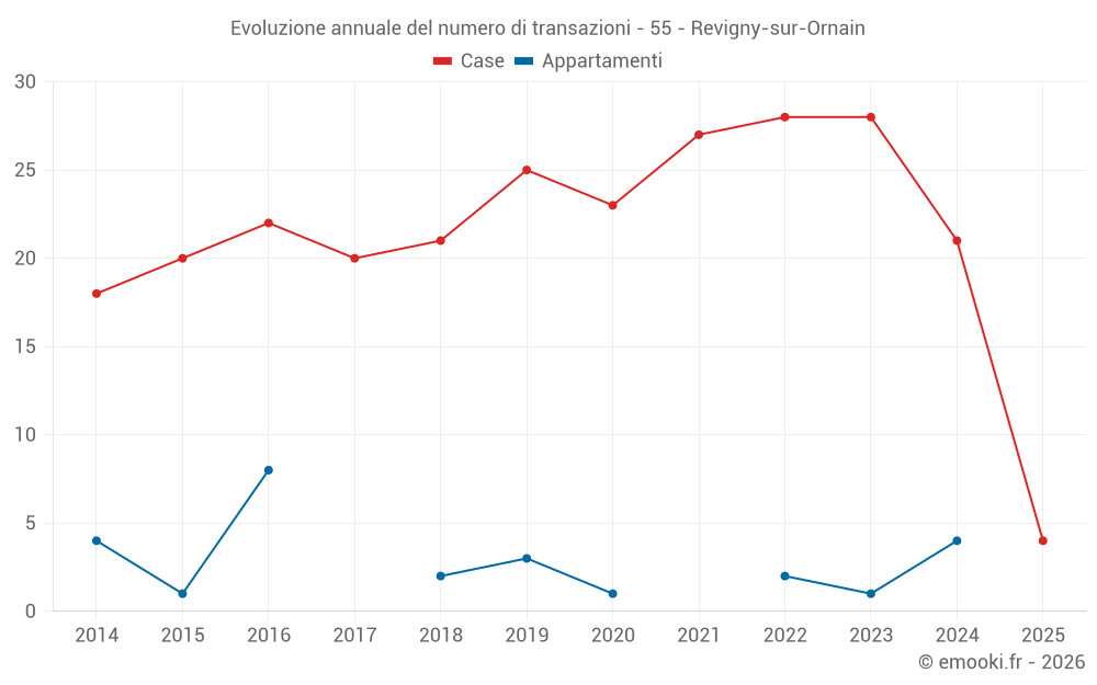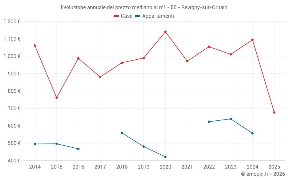 Il prezzo mediano sulle 34 transazioni di case degli ultimi 24 mesi nel comune di Revigny-sur-Ornain era di 1 045 € al metro quadrato per un valore patrimoniale mediano di 118 500 €. In questo periodo il 60% delle transazioni era tra 861 e 1 498 € al metro quadrato (dal 2° all'8° decile).