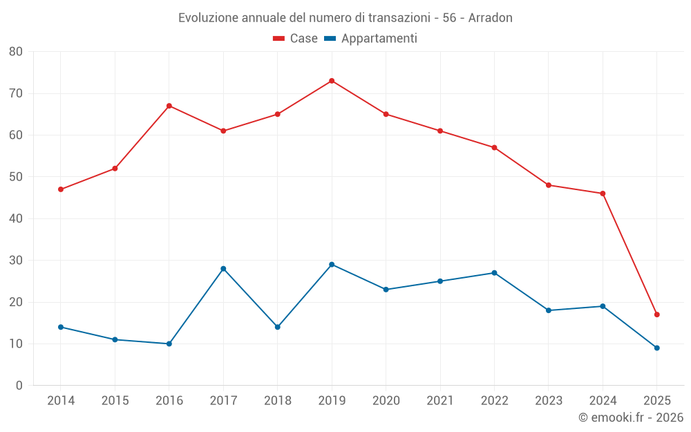 Il prezzo mediano sulle 47 transazioni di case degli ultimi 12 mesi nel comune di Arradon era di 5 000 € al metro quadrato per un valore patrimoniale mediano di 545 000 €. In questo periodo il 60% delle transazioni era tra 4 266 e 6 406 € al metro quadrato (dal 2° all'8° decile).