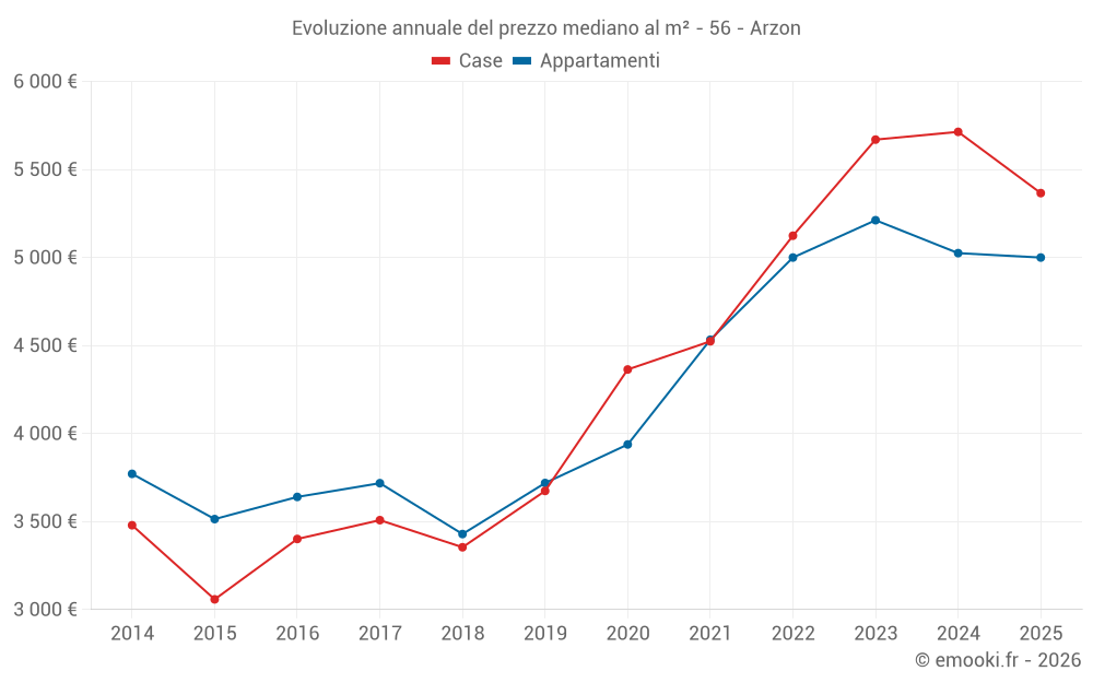 Il prezzo mediano sulle 24 transazioni di case degli ultimi 6 mesi nel comune di Arzon era di 5 366 € al metro quadrato per un valore patrimoniale mediano di 500 000 €. In questo periodo il 60% delle transazioni era tra 3 778 e 8 232 € al metro quadrato (dal 2° all'8° decile).