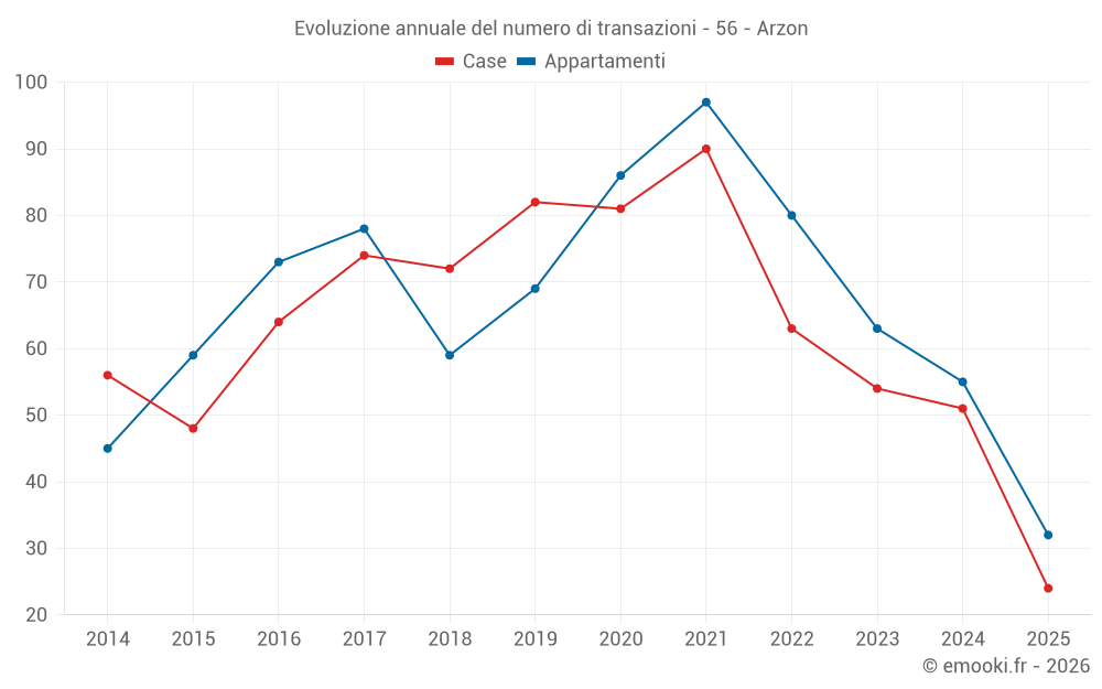 Il prezzo mediano sulle 32 transazioni di appartamenti degli ultimi 6 mesi nel comune di Arzon era di 5 000 € al metro quadrato per un valore patrimoniale mediano di 164 650 €. In questo periodo il 60% delle transazioni era tra 4 045 e 6 103 € al metro quadrato (dal 2° all'8° decile).