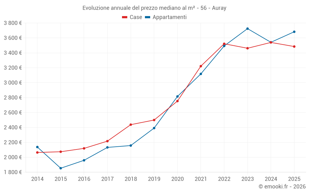 Il prezzo mediano sulle 23 transazioni di case degli ultimi 3 mesi nel comune di Auray era di 3 360 € al metro quadrato per un valore patrimoniale mediano di 360 000 €. In questo periodo il 60% delle transazioni era tra 3 090 e 4 027 € al metro quadrato (dal 2° all'8° decile).
